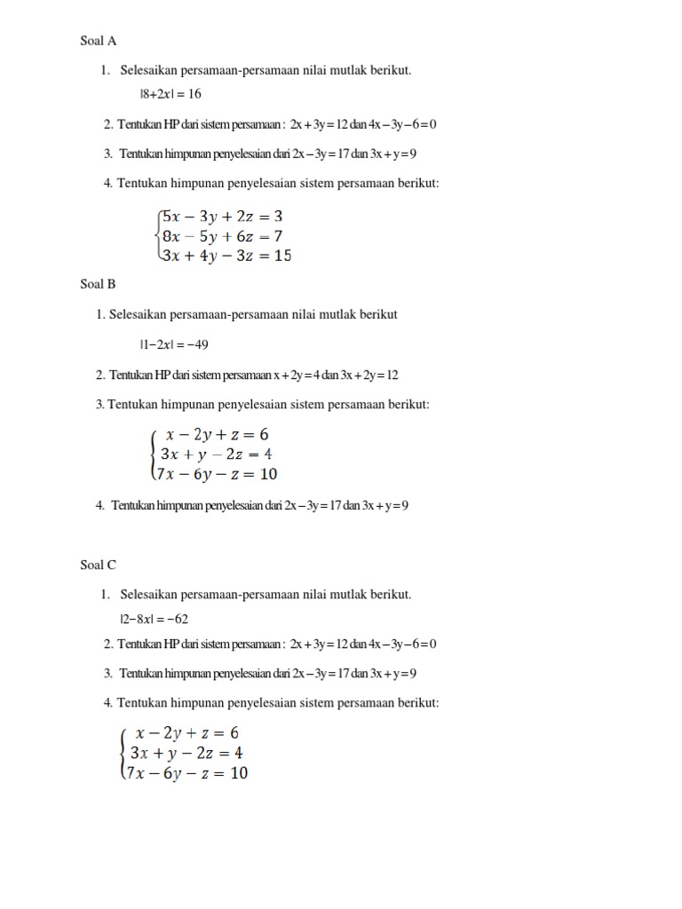 Pertidaksamaan nilai mutlak merupakan jenis pertidaksamaan yang mengandungnilai mutlak. Nilai mutlak dari suatu bilangan x dapat diartikan sebagai jarak bilangan tersebut terhadap titik 0 pada garis bilangan, dengan tidak memperhatikan seperti yang dinyatakan dalam sifat persamaan nilai mutlak, sifat ini hanya dapat diterapkan setelah kita mengisolasi simbol nilai mutlak pada satu ruas. Daftar isi pengertian persamaan nilai mutlak satu variabel konsep nilai mutlak nilai mutlak x merupakan sebuah jarak dari x ke nol dalam garis bilangan real. Untuk lebih memahami nilai mutlak dan persamaan nilai mutlak mari kita simak beberapa soal latihan berikut. Bantu jawab dan dapatkan poin.